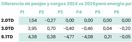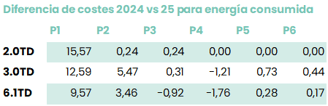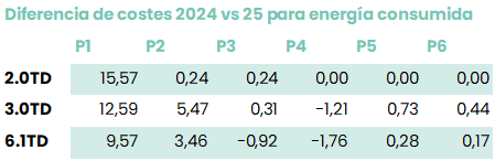 Primero de todo en la siguiente tabla encontrarás el diferencial de los antiguos costes con los nuevos costes de 2025 para la parte de consumo energético:
