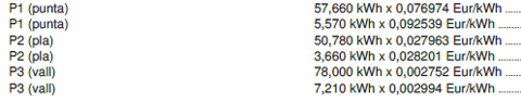 Como se puede observar, se tienen diferentes cargos a diferentes precios por cada periodo de consumo: punta, llano y valle. Esto es porque la comercializadora ha facturado los días de diciembre a los costes de 2024 y los días de enero a los nuevos costes regulados. Como se observa en la imagen, algunos suben bastante y otros bajan un poco.